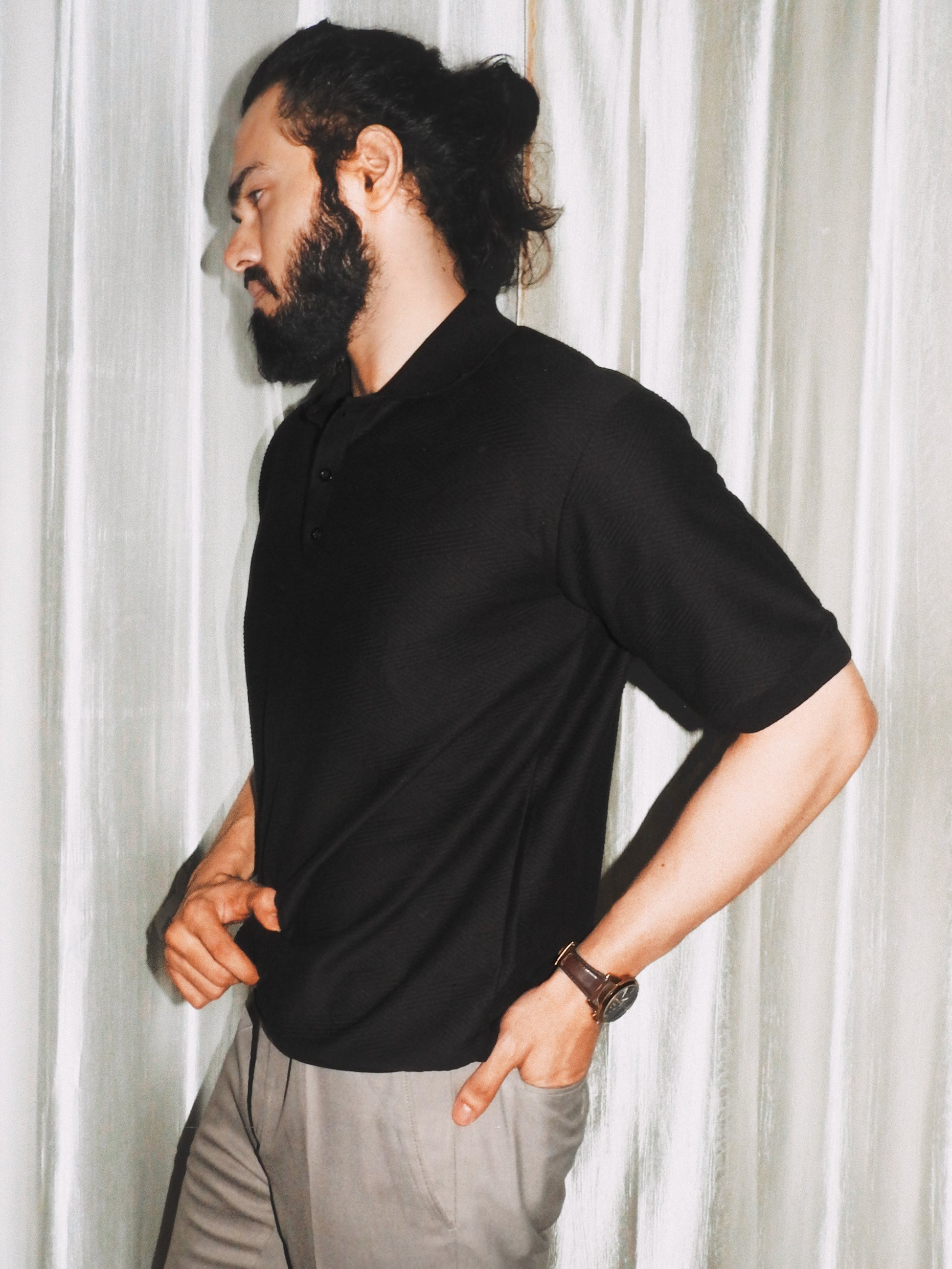 Cut out of blended jacquard knit fabric (80% Cotton, 20% Polyester), this polo features a geometric herringbone pattern and a classic 3-button placket. Tailored for a relaxed and loose fit with sleeves flowing down to the elbows. 2x2 cotton rib used on the waistband provides structure to the garment even when untucked.