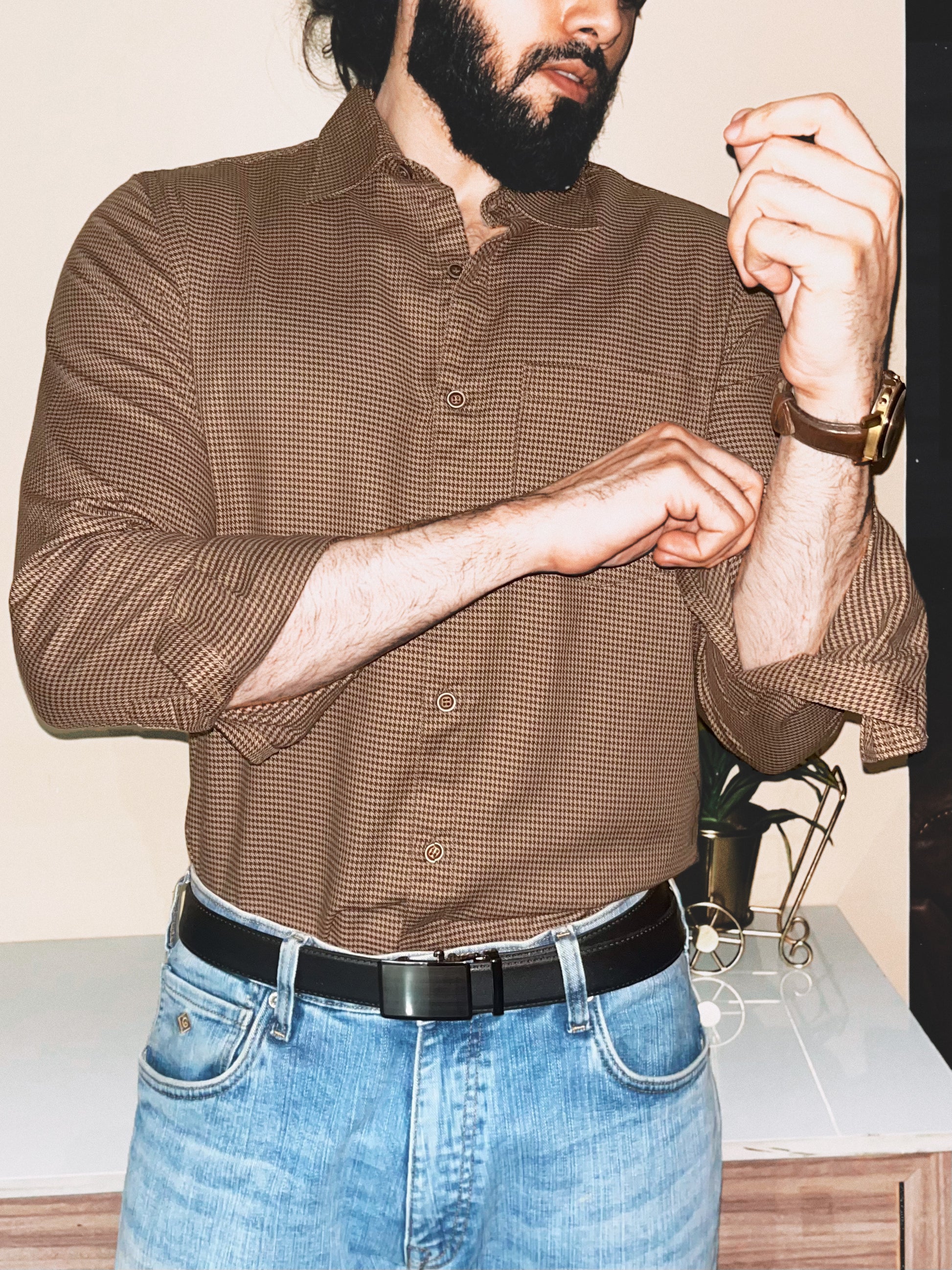 Cut out of soft, 100% cotton flannel, this shirt features small houndstooth checks in golden wheat and brown colour. Tailored for a classic fit facilitating easy movement without being too body hugging or loose. Perfectly suitable to be worn as a standalone piece or layered under a blazer or jacket.