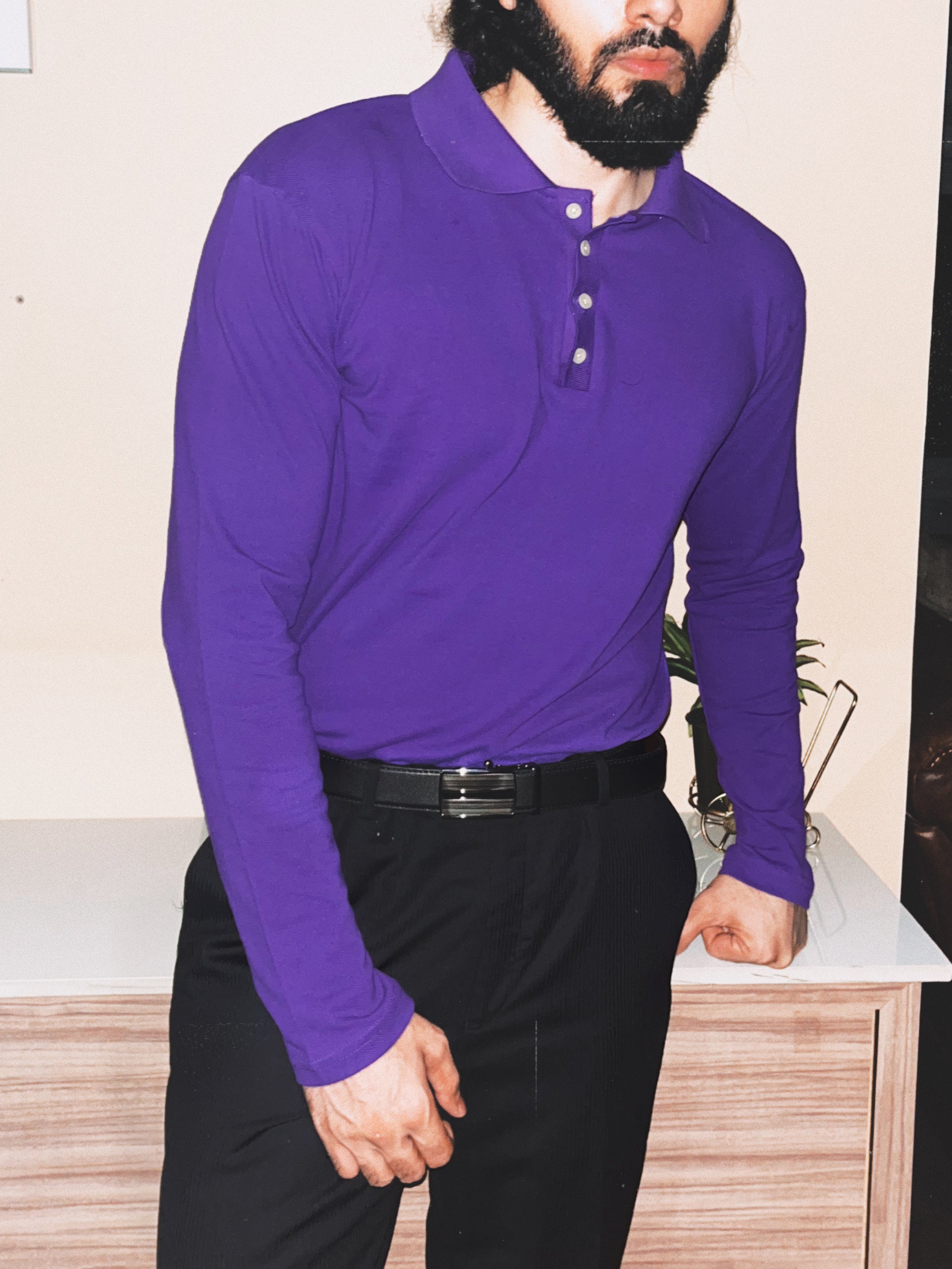 Cut out of 220 GSM pure cotton pique fabric, this long-sleeved polo features classic spread collars with a 4-button placket construction. Matte purple fabric paired with matte-finish cream buttons. Tailored for a regular fit facilitating comfortable movement. Perfectly suitable to be worn as a standalone piece or layered under a jacket or blazer.