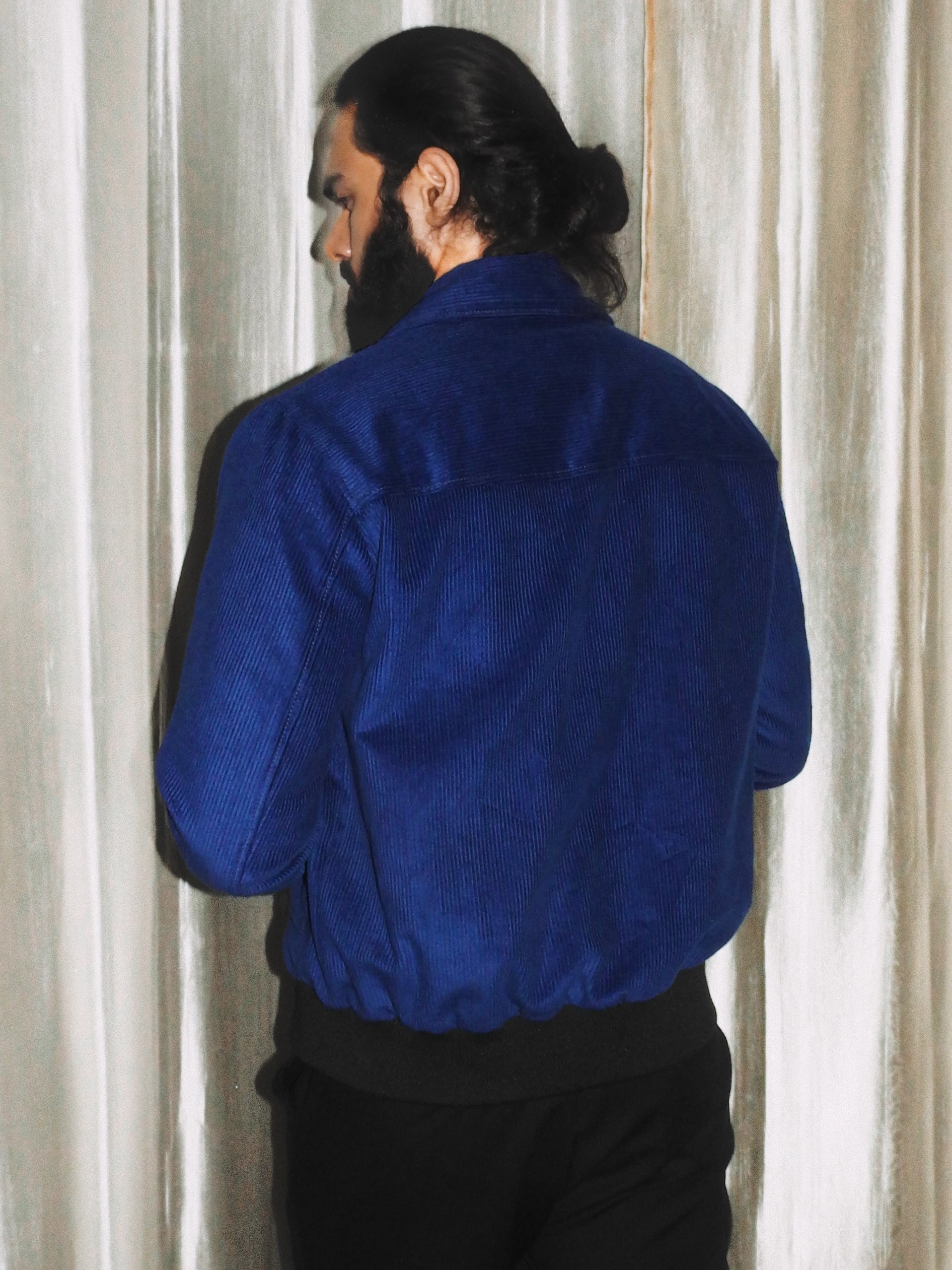 The outer shell is cut out of 100% cotton 8-wale corduroy in a royal blue shade, with black ribbed cuffs and hem to provide structure at the waist and cuffs. Tailored for a relaxed and loose fit through the chest and body. Antique Brass teeth YKK zipper used in the front closure alongside Antique Brass Snap buttons on the front pockets. Smooth polyester lining to facilitate easy motion.