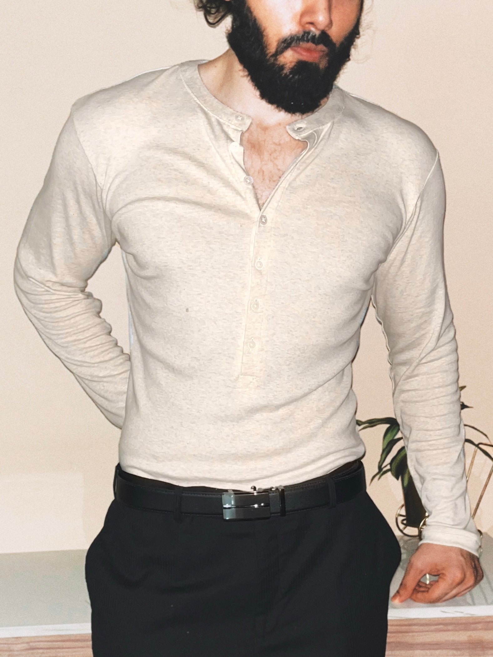 Cut out of a ribbed blend of cotton and elastene, this Soldado Ribbed Henley comes in a light greige melange shade (light beige base infused with light grey yarns) featuring long sleeves and a deep placket with a 7-button construction. Tailored for a slim, body-hugging fit and a sleek silhouette. A hint of spandex in the blend gives it the necessary stretch for the desired look. Perfectly suitable to be worn as a standalone piece or layered under a blazer or jacket.