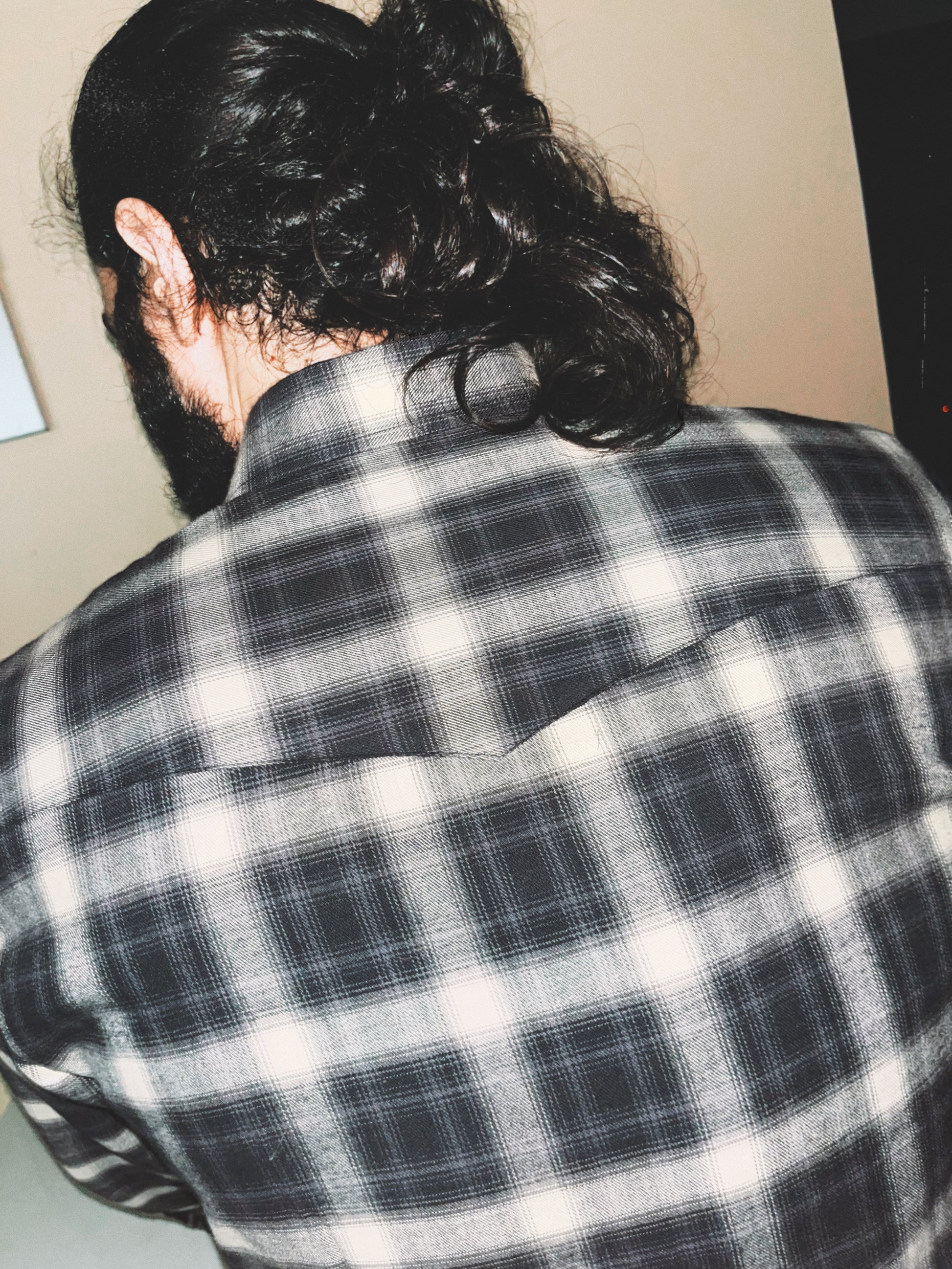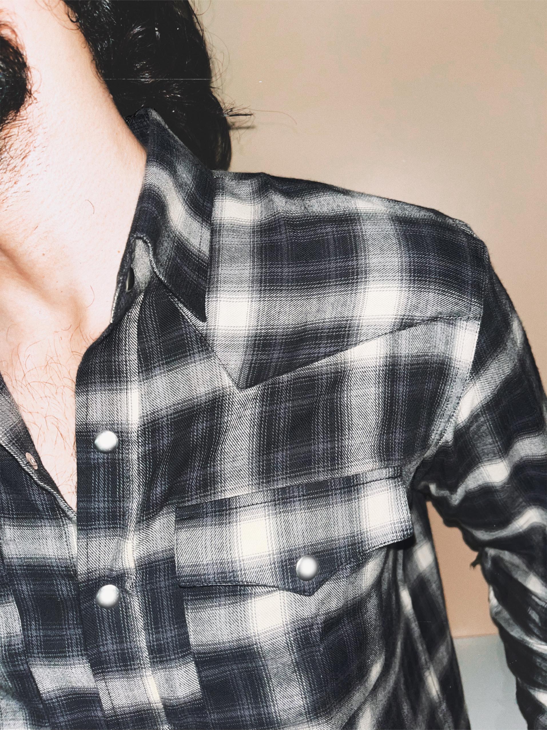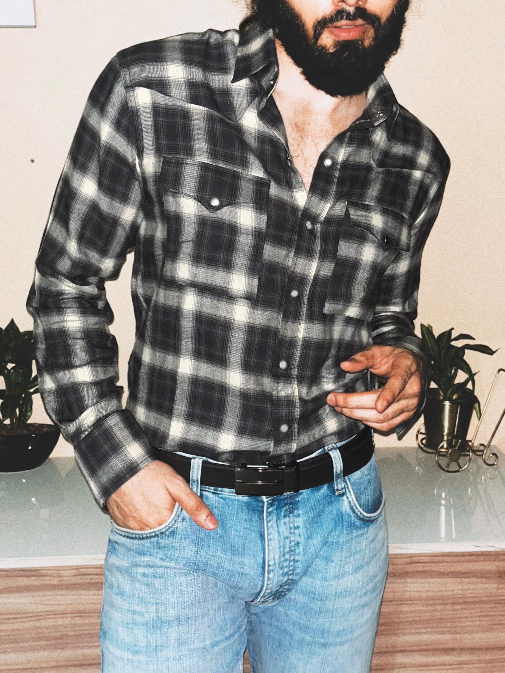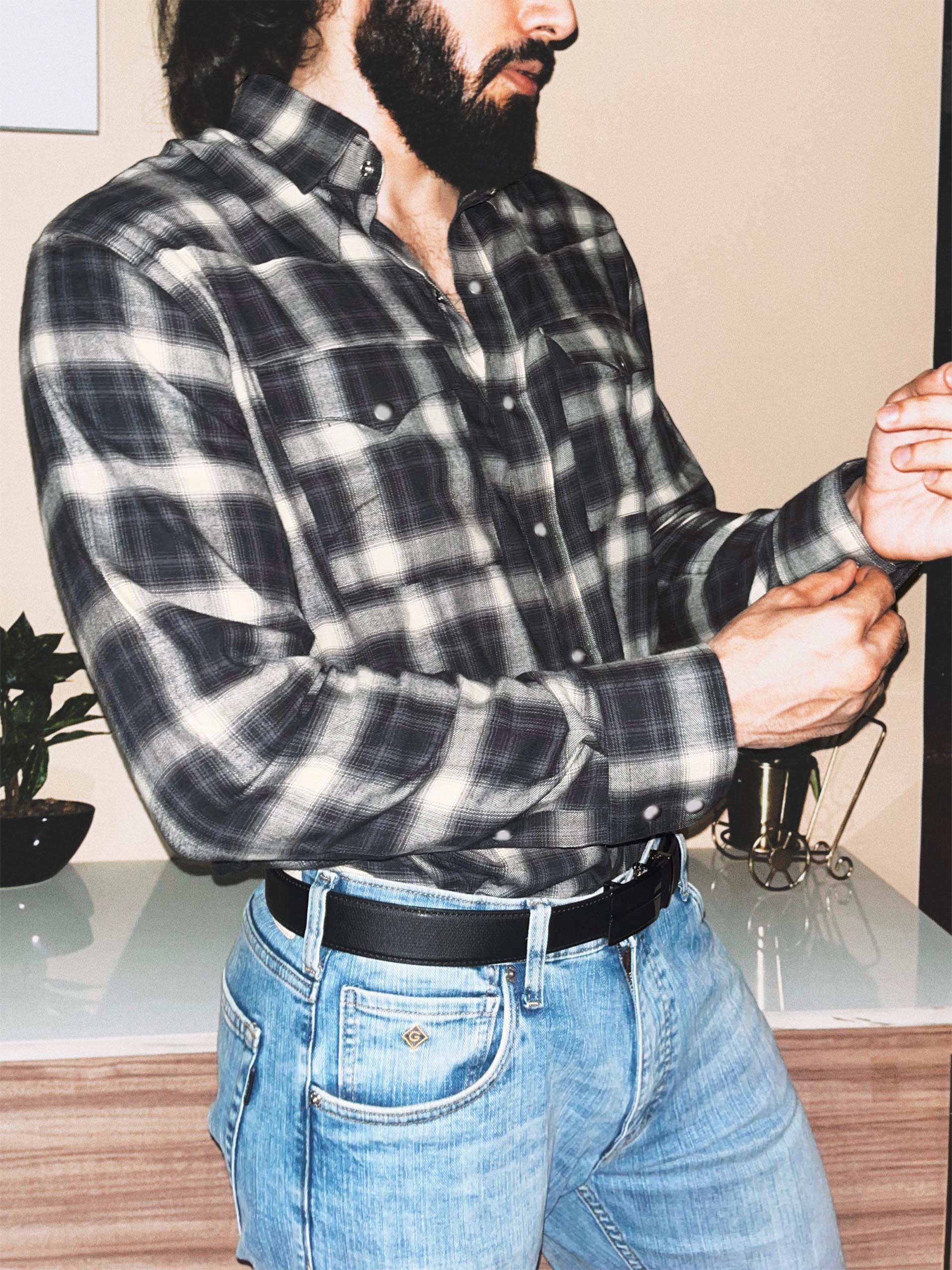 Cut out of cotton fabric, this lightweight shirt comes in a combination of black, cream and grey checks with a soft brushed finish. Features an inverted pleat front yoke, western back yoke and double breasted flap pockets on either side. Silver finish snap buttons on the placket, pockets and cuffs. Relaxed and loose fitting facilitates easy movement. Tuck in if you’re going for a country look or leave it untucked for a more casual look.